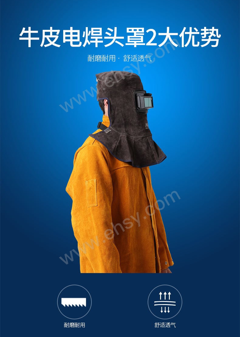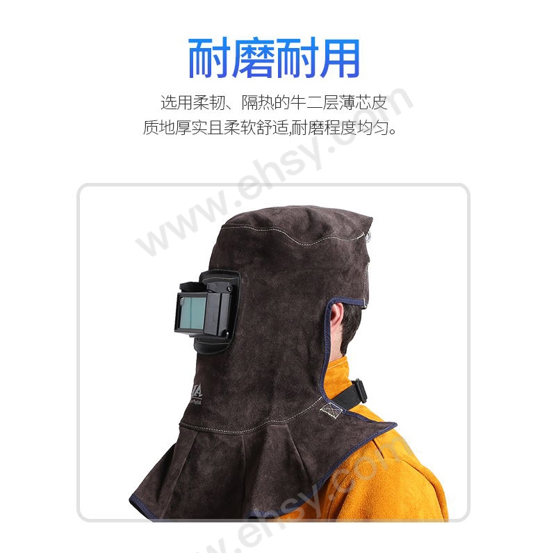 • 加長(zhǎng)披肩設(shè)計(jì),更有效防止火花,焊渣,灰塵等滑落頸部及弧光灼傷面部