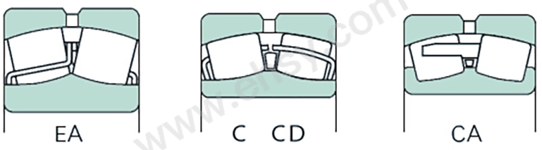 ?????? 調(diào)心滾子軸承,如圖所示,有高承載設計的EA型,C型,CD型,CA型。設計上,EA型,C型,CD型為沖壓保持架,CA型為銅合金車制保持架。EA型軸承具有高承載,低力矩的特長