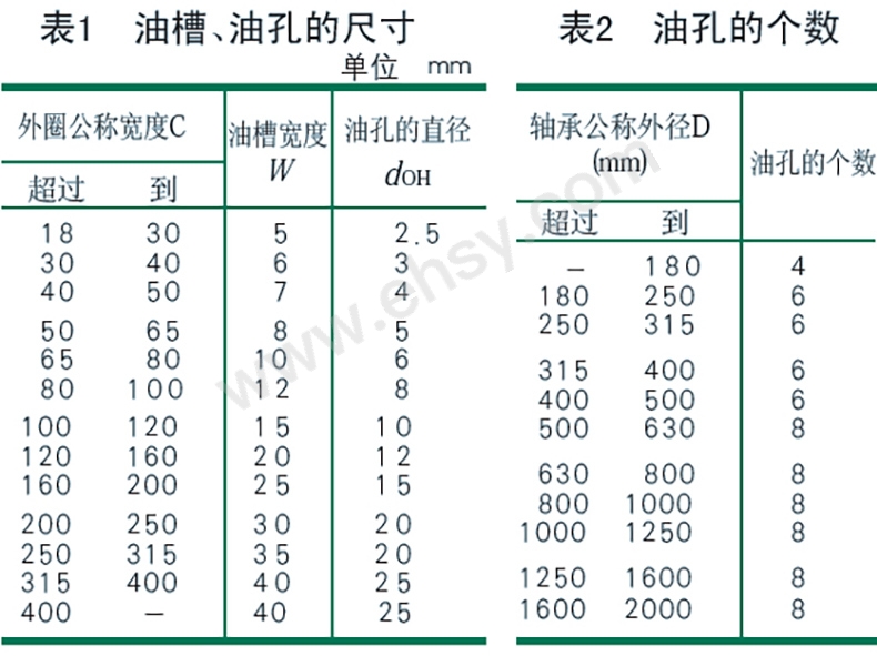 ?????? 另外,使用帶有油槽,油孔的軸承時,因軸承油槽深度有限,所以如在外殼內(nèi)徑上也設置出油槽則更為有效。軸承的油槽,油孔的尺寸和個數(shù),依照表1,表2。