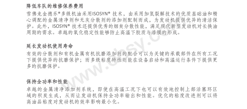 • 金德樂?多級機油是高性能、多級的重型柴油發(fā)動機油。采用ISOSYN?技術(shù)精心配方而成。廣泛適用于要求采用API CH-4和CF級別發(fā)動機油的柴油發(fā)動機。