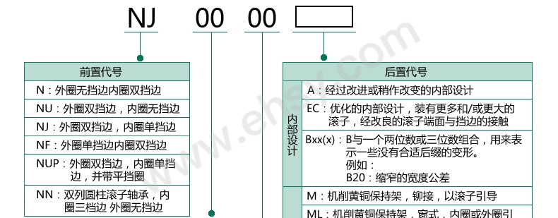 • NJ型軸承的外圈兩側(cè)帶擋邊,內(nèi)圈一側(cè)帶擋邊。它們僅允許軸相對(duì)于軸承座在一個(gè)方向上的軸向移動(dòng);