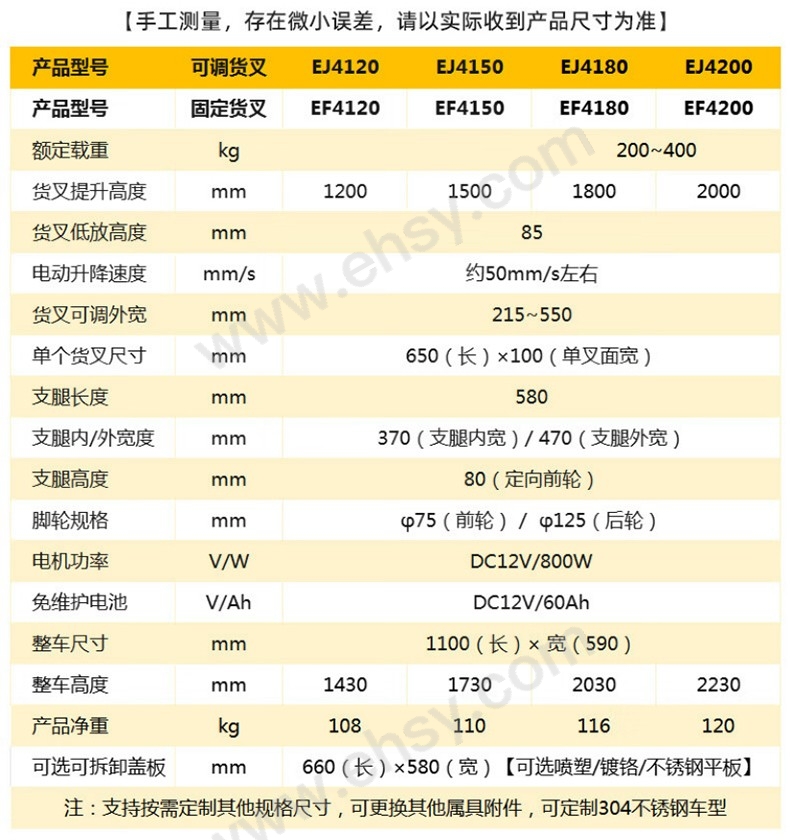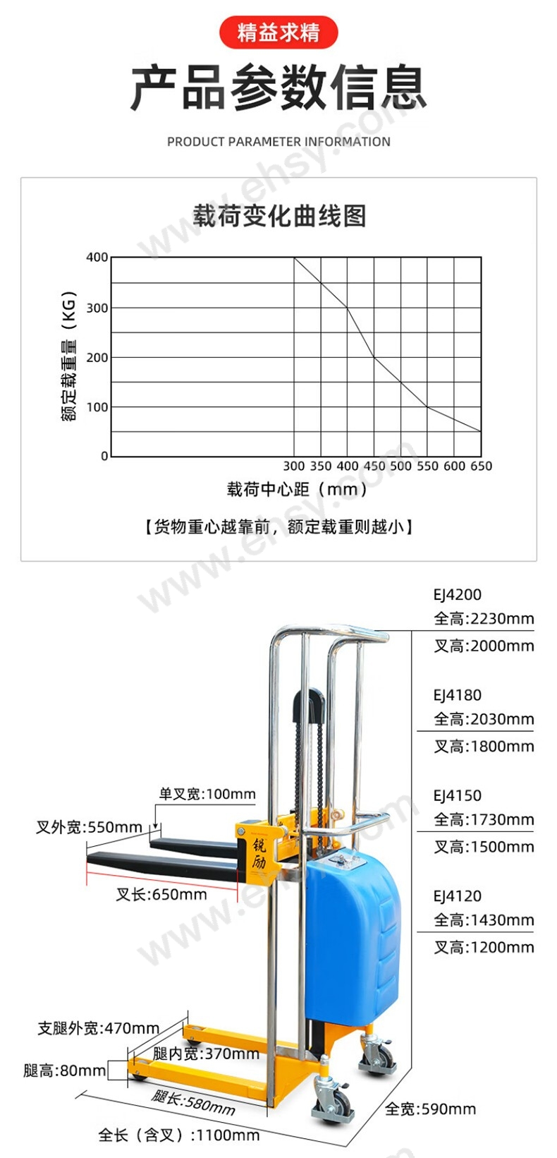 銳勵 半電動堆高車,EJ4200雙鏈條 載重200-400KG,提升高度2000mm,貨叉尺寸mm:550*650 售賣規(guī)格:1臺